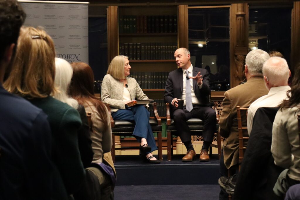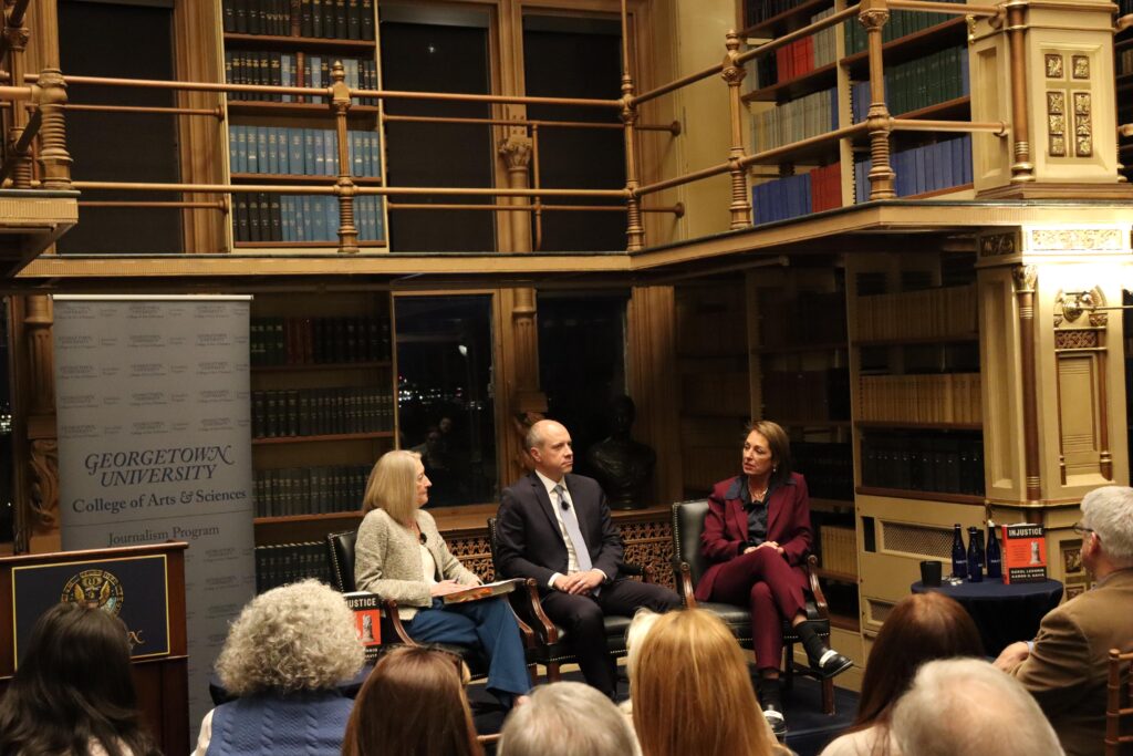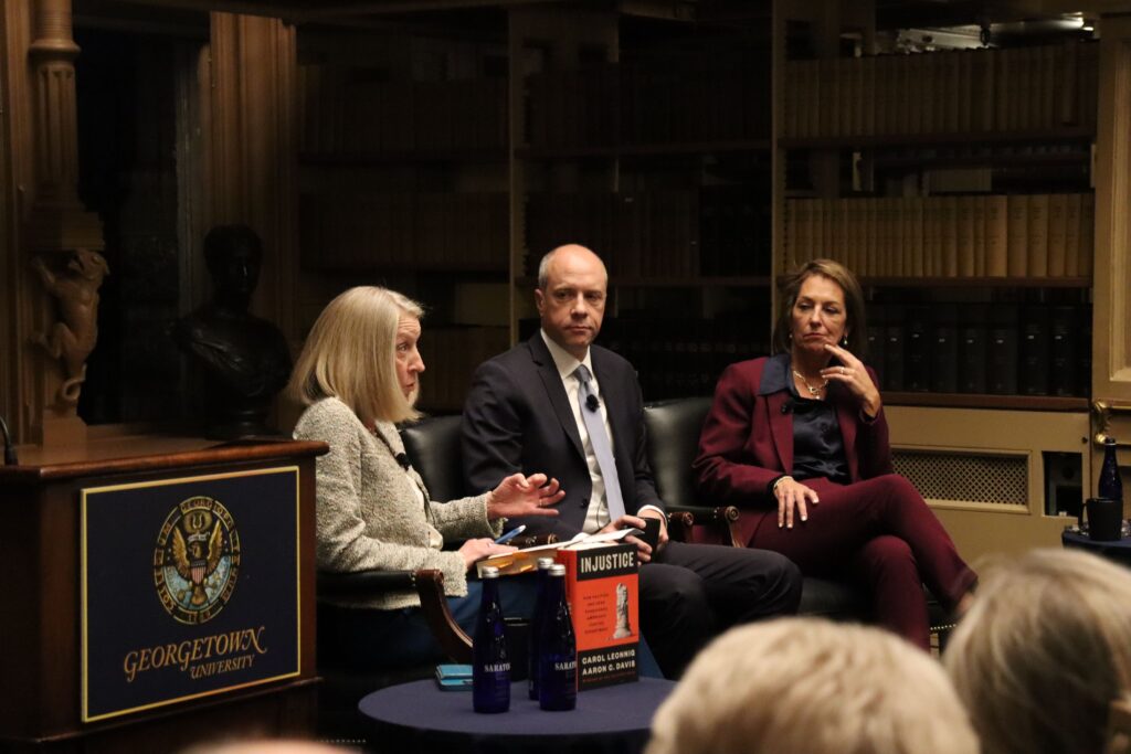 On Nov. 17, 2025, Pulitzer Prize-winning reporters Carol Leonnig and Aaron C. Davis spoke to a packed crowd in Riggs Library about their new book Injustice: How Politics and Fear Vanquished America’s Justice Department. Their book exposes not only the Trump administration’s efforts to undermine the department at every turn but also how delays in investigating Trump’s effort to overturn the will of voters under Attorney General Merrick Garland helped prevent the country from holding Trump accountable and enabled his return to power.